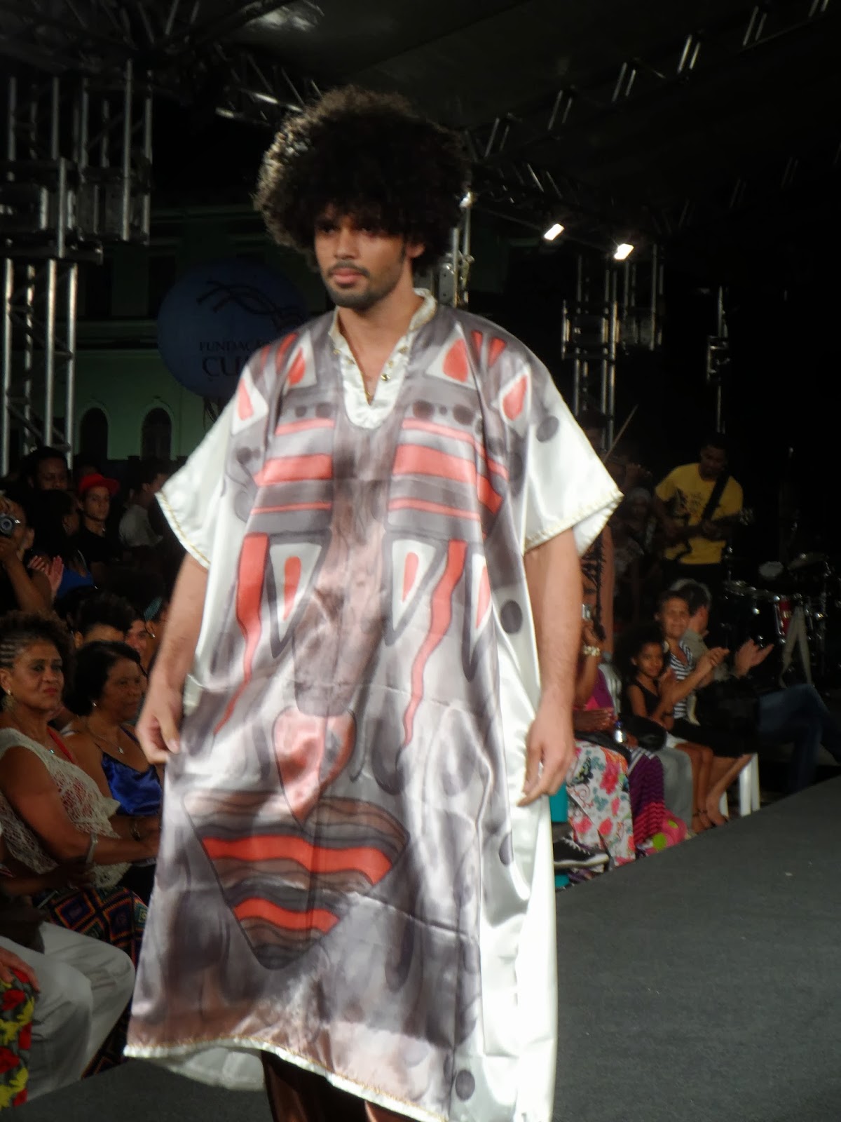Muito branco que é uma forte tendência do que eu faço, porque representa força, simboliza paz, tem a ver com o nosso clima, com as matrizes africanas. Mas também muito colorido, estampas que são exclusivas de uma pesquisa que eu mesma faço.